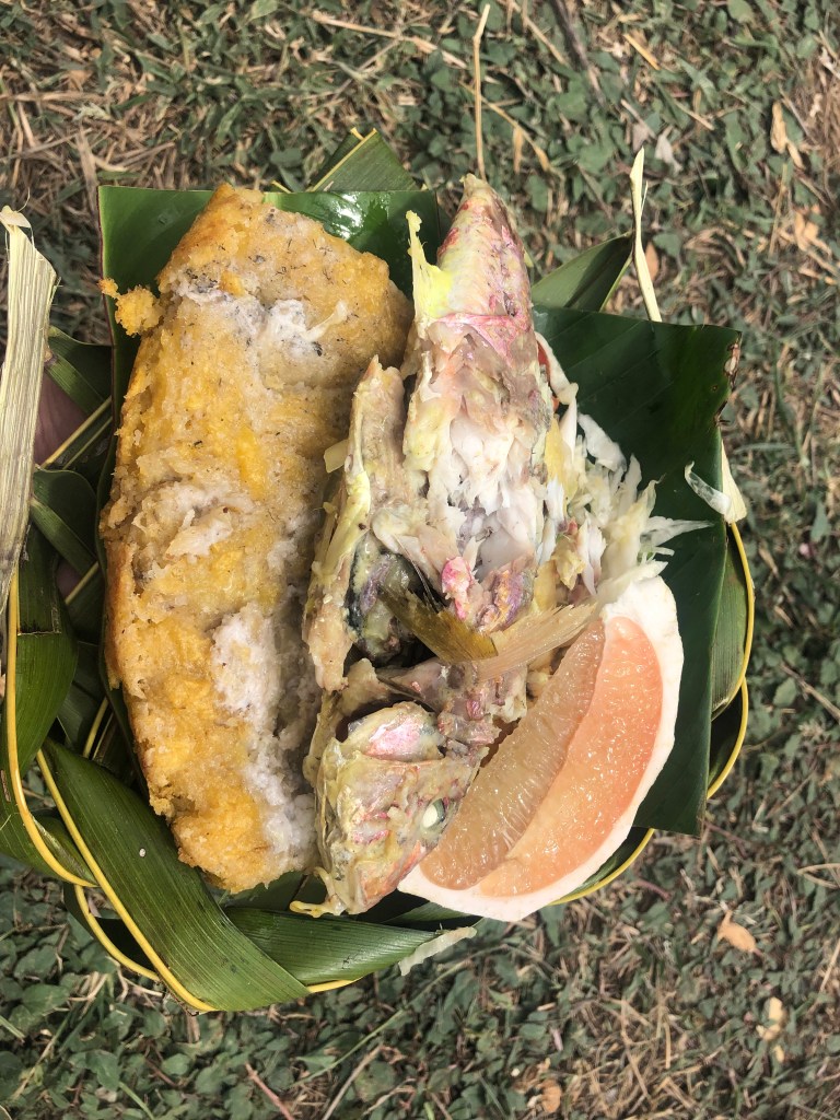 We were served a variety of local food for dinner that was cooked in their traditional below ground oven system using rocks and banana leaves. Chicken was the main dish that was served to us, and it had about 1/4 of an inch pink smoke layer.