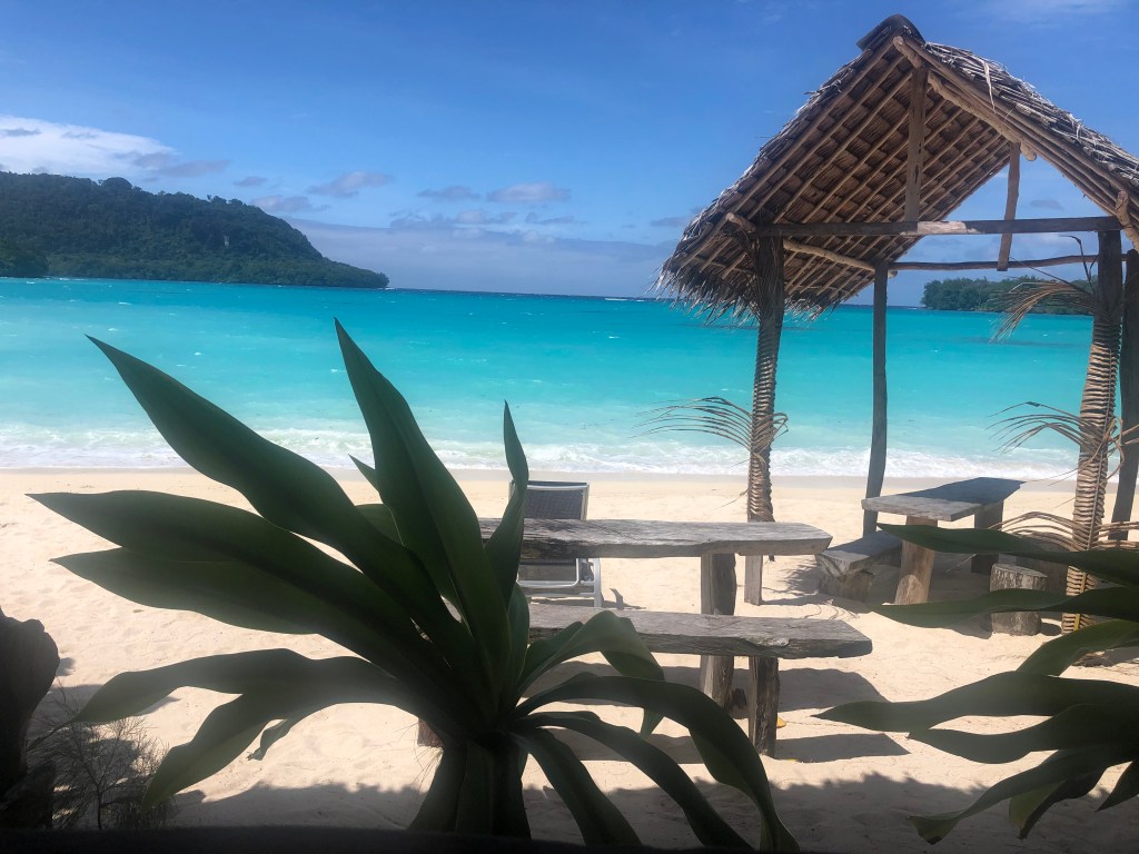 The weather was great beach weather, hot, humid, and cloud-free. We spent two hours swimming, snorkeling, and reading our books on the helix beach chairs that my parents left. We were the only people on the beach that had beach chairs, I guess that most people do not travel with them… We got back in the car, and our driver indulged our multitude of questions about life in Vanuatu. We then headed to Port Orly for lunch. Port Orly had a nice beach, but it was not protected and was really windy. We had a good lunch, that wasn’t the speediest, but was just what we needed.