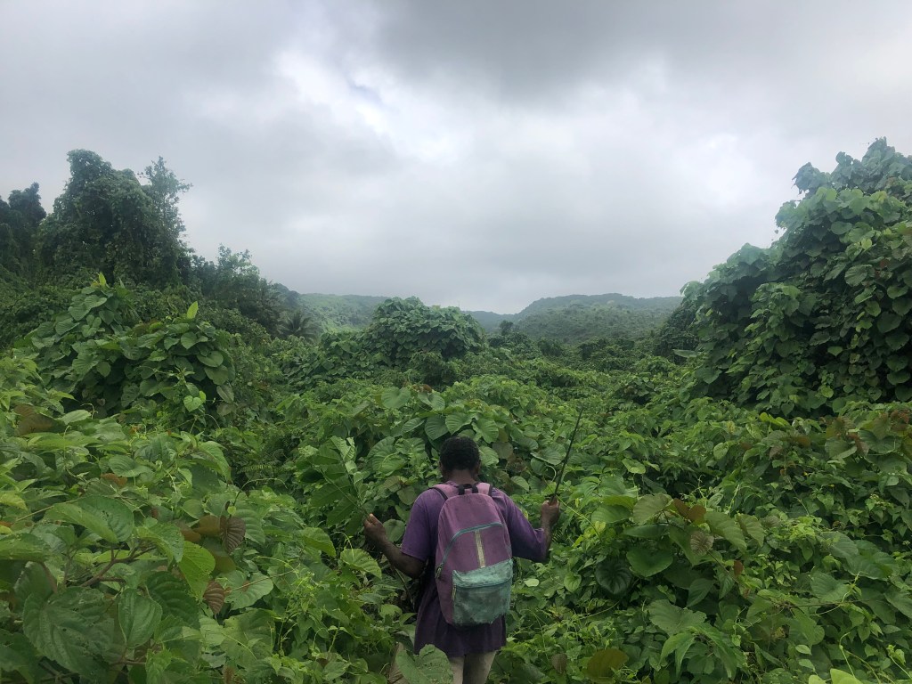 John said that the local story is that black magic was responsible for the decline in population, but the truth is probably that western disease from explorers was the prime culprit. The worst part of the walk was in an area that was a really large taro field up until the 1980s. The people that grew taro there moved, and the field was left to be taken over by two types of vines. One was called the American vine since it was not in Vanuatu until the US arrived there during WWII. It was just a solid mass of vines with a faint trail that involved a lot of machete swinging and avoiding tripping over the ankle level wines that escaped the machete. The areas where there were trees were a lot easier to walk because many of the vines need the sun and grew over the trees instead of through them. We got back and were thirsty and dirty. Luckily we were greeted with a cold jug of lemonade. Katy took a shower and drank the last of rum.