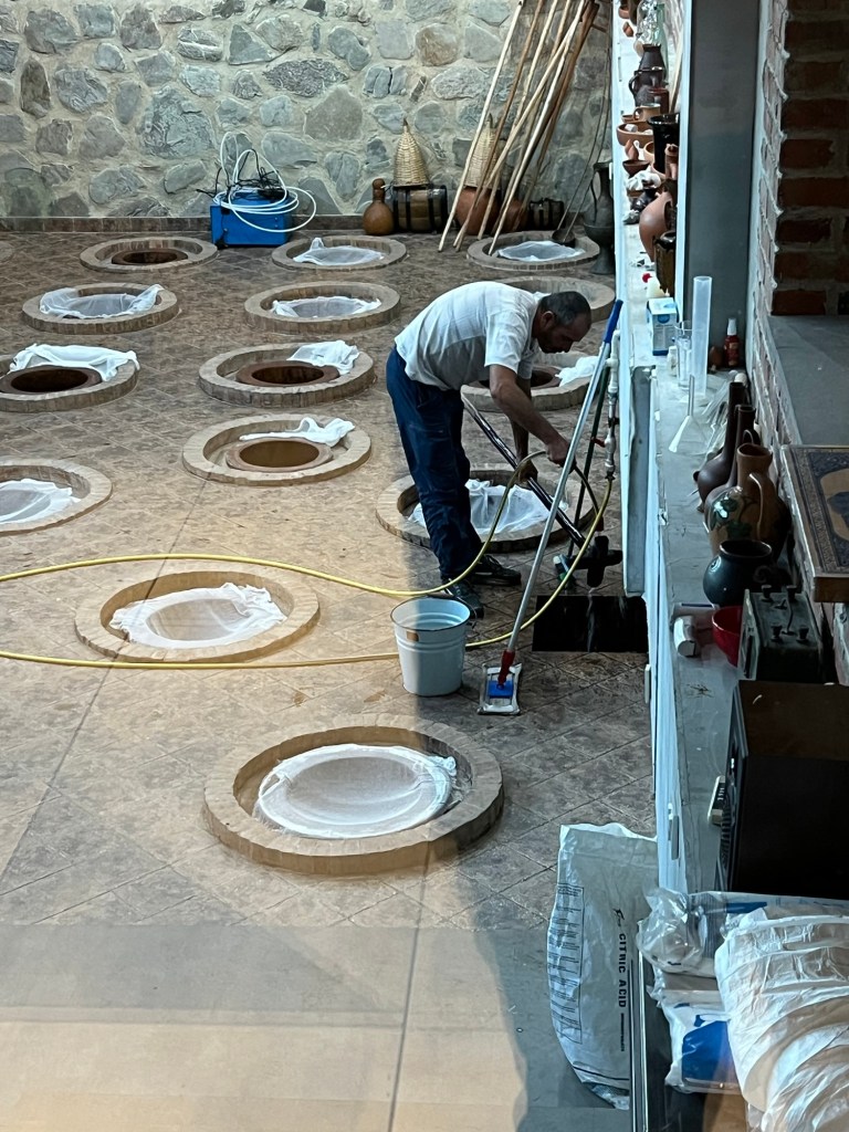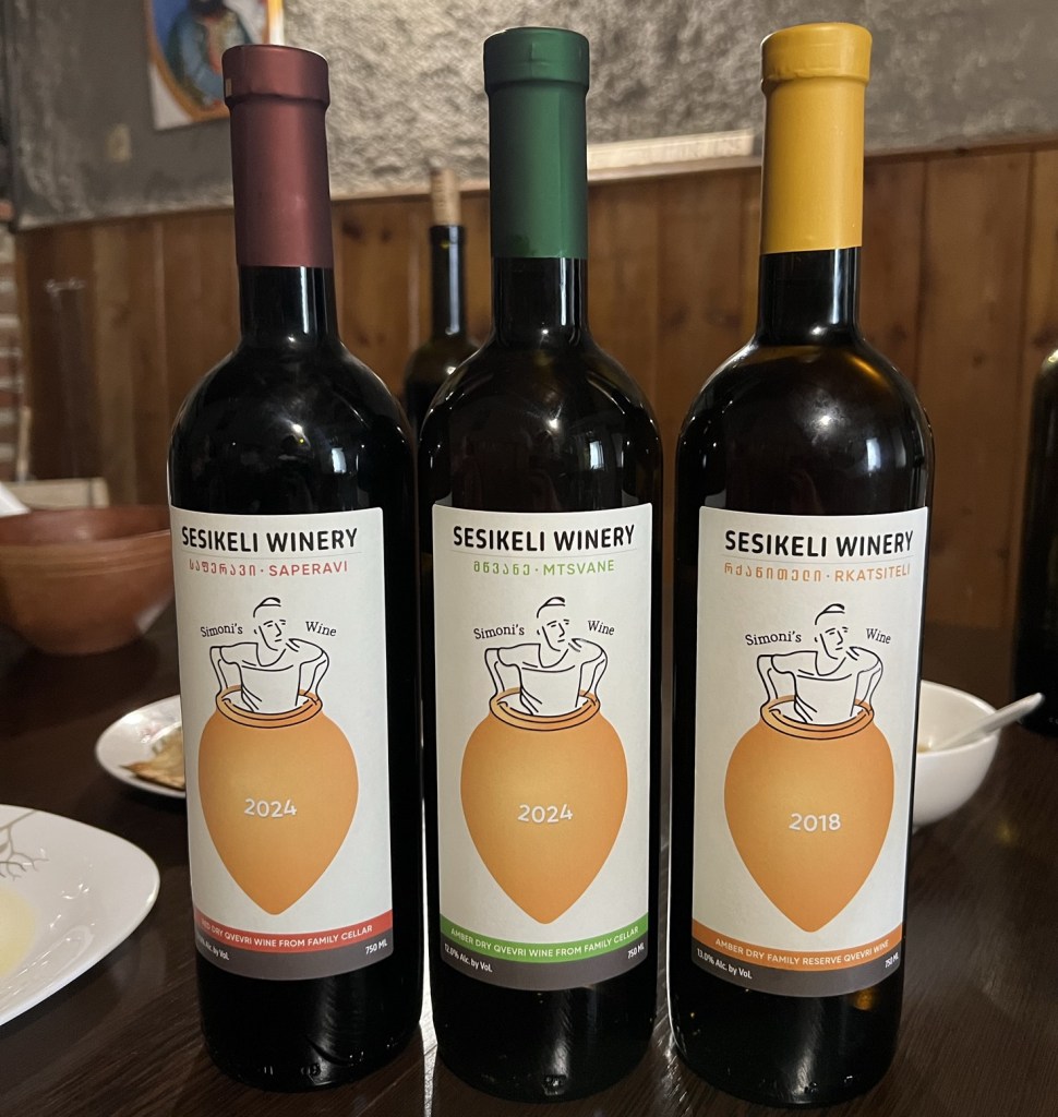 After some hotel breakfast the next morning that did not start until the lofty hour of 9am, we headed out on our wine tour with the first spot being a small operation that owns their own vineyard outside of town and then brings their grapes to their house to make their wine. The “traditional” method of wine making in Georgia is to bury large clay pots and have the wine ferment in there, usually for 6+ months. When they do this with white grapes, they leave the skins on, which gives the wine an orange or amber color.
