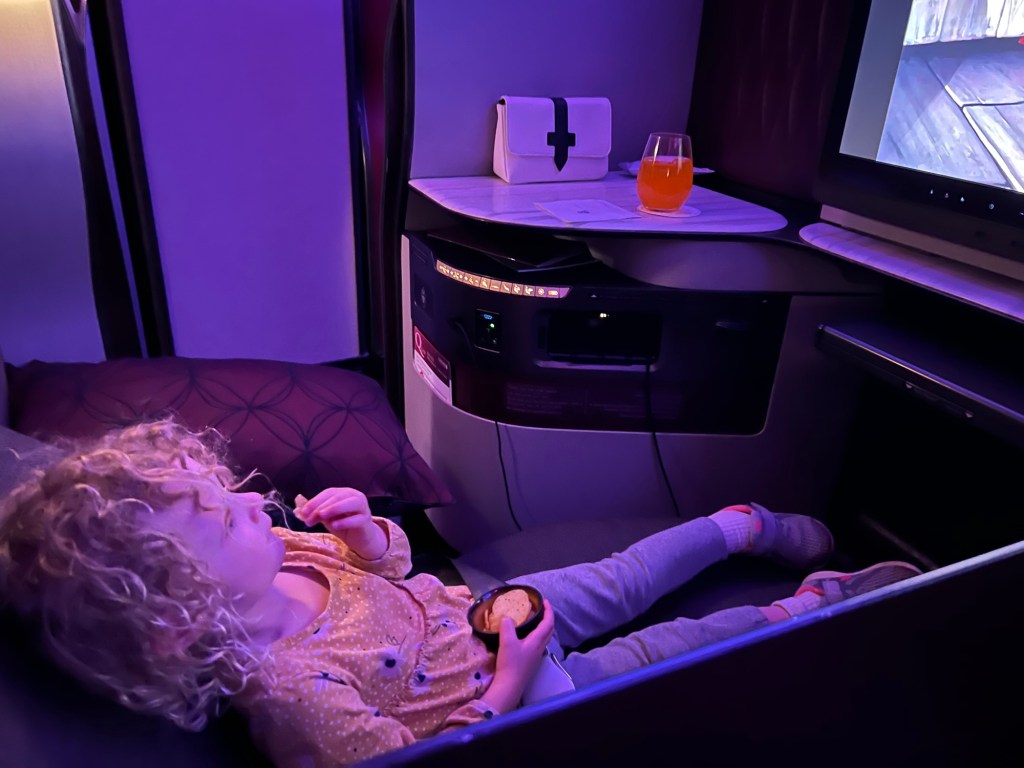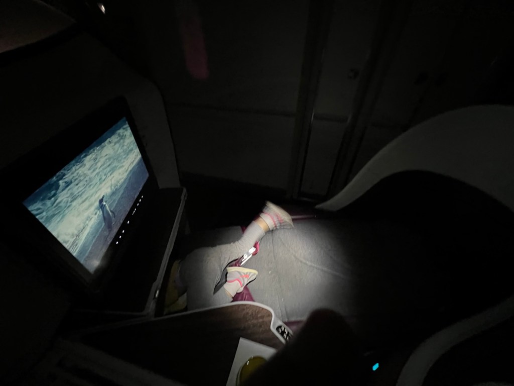Rose scored a B+ on the flight where she ate her dinner, watched a little TV, and then fell asleep for 8 to 9 hours. She woke up, had 2 to 3 hours to eat some breakfast and watch more TV, and then we arrived in Qatar around 4 PM.