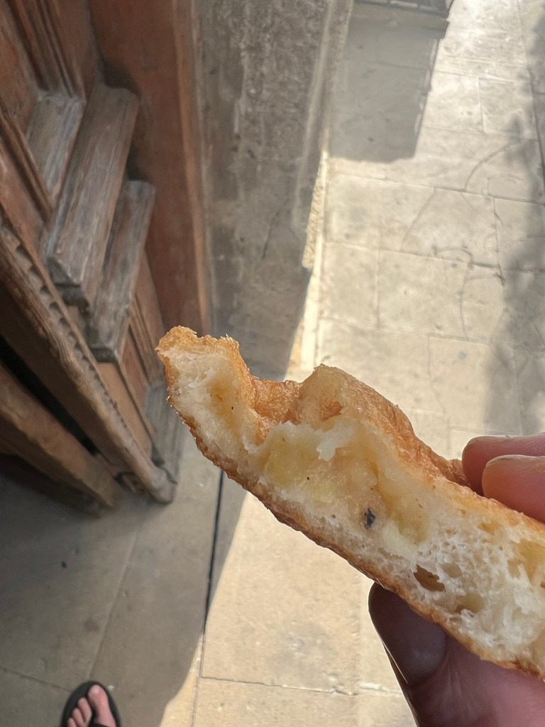 We decided to leave at 9:30 in the morning, which gave us enough time to order some Uber Eats—mashed potato filled fried dough, and fried dough with apple jelly inside—for $4, including tip.