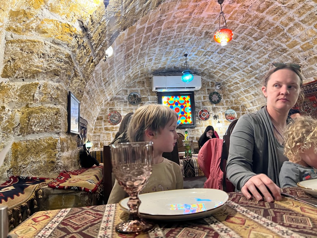 We then went out to the restaurant Ani, which didn’t have a menu on Google, but I read online people liked it. They put us in a back room, and the kids could frolic and not disturb the front of the restaurant, which filled up. The food was really cheap and good (Katy’s huge stuffed trout was $11). Music started, and it was a touch too loud for Archer, but Rose was a fan, so we went out front and watched the 4-piece band.