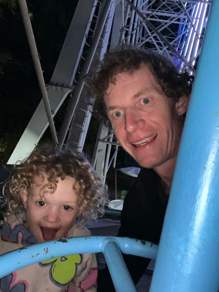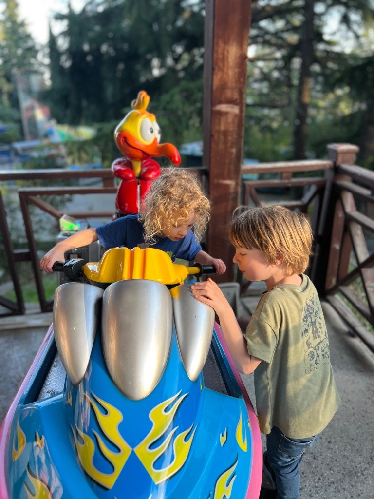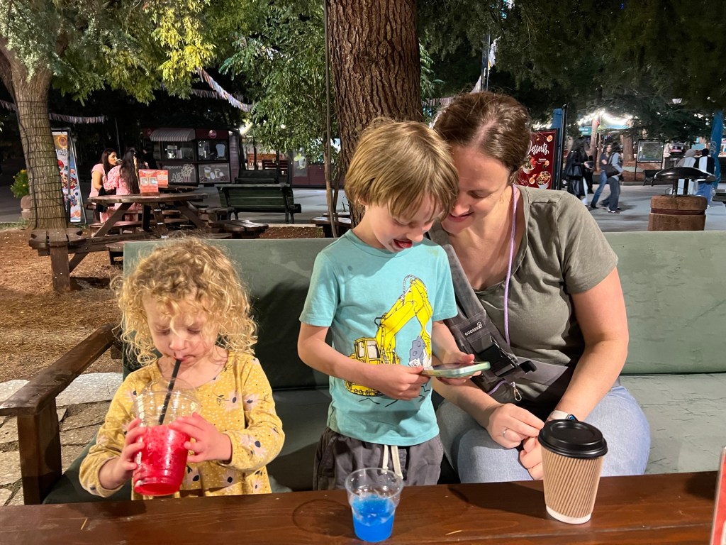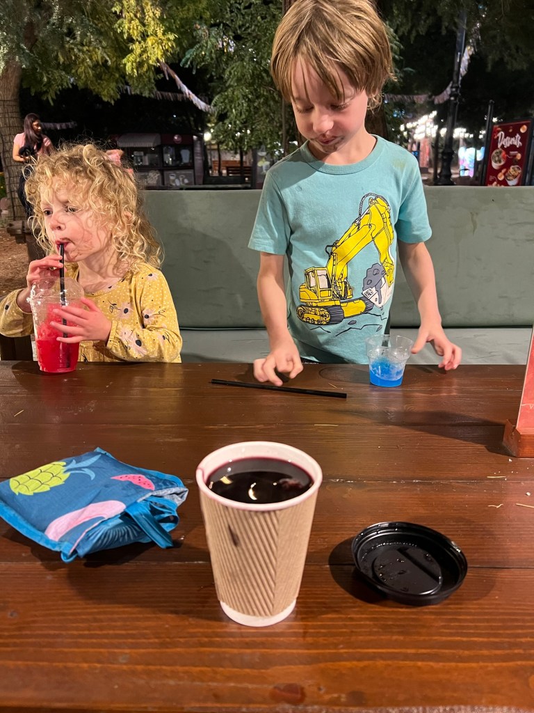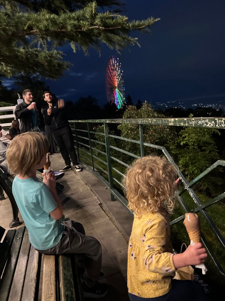 We took the cable car up to the amusement park (our second visit). The kids rode some rides, Rose went to the petting zoo (archer didn’t want to), we rode the Ferris wheel, and ate dinner. The kids got slushees to end the night; the guy recognized us from the other day and gave us three, one of each flavor. It turns out the green is tarragon flavored and not too sweet.
