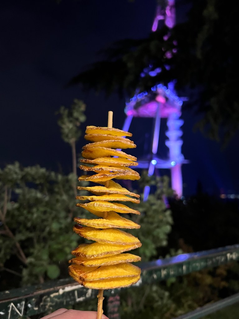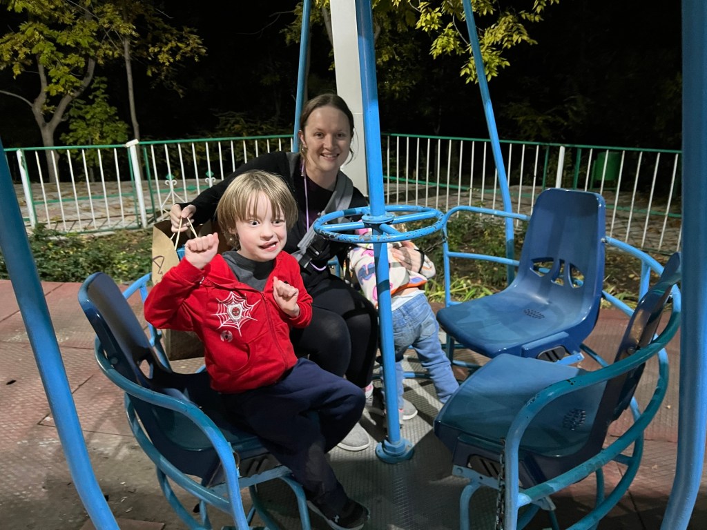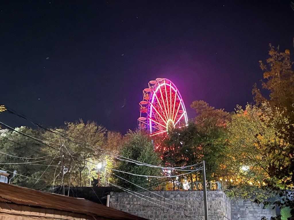 We almost made it home when Archer noticed the Ferris wheel was lit up, so we went to do the Ferris wheel. It cost $2.50. It likely has not been updated since the fall of the USSR. It was kind of 4 lawn chairs welded to a metal plate with a central handle to hold on to. No sides. They did put a small chain over the “door.” It did not squeak as much as the one Katy wouldn’t let me ride in Tbilisi.