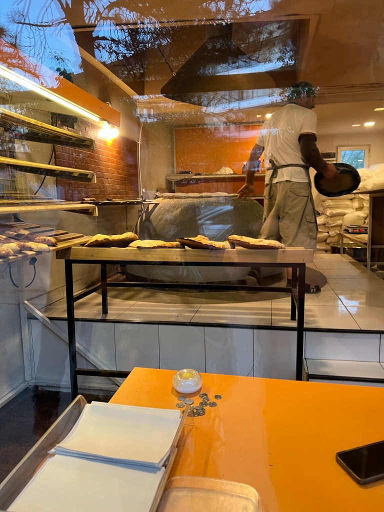 All of us then went out, and Katy grabbed a coffee, and we wandered across the river to a new park that also had a water park. While looking for a bakery earlier in the day, I had happened on an article from a baker saying their favorite places to get bread products, and we were near one. Luckily google maps had a photo of when they used to have a sheet of paper with their products taped to the front of their store. There was nothing like this when we got there and google translate got us – round bean filled bread, a long potato filled bread, and a “layered kachapuri” which was more puff pastry dough with their traditional cheese in the middle. These are all cooked in a tone, which is a traditional clay oven. We then went back to the park and ate our yummy early lunch while Rose worked up the courage to go in the splash pad.