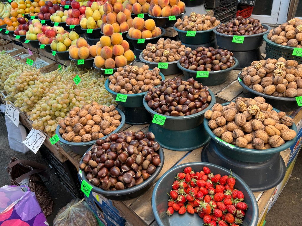 We bought some sweets from this stand. Walnuts are in season. The balls are fruit leather covering walnut and apricot.We got some pears and strawberries here.