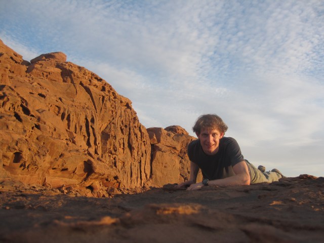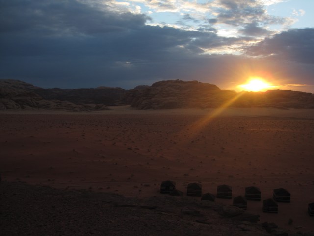 The jeeps they drive ranged from the 1970’s to the mid 2000s, but my guide had never driven one newer than 1998.  He is also one of 17 children and his father has two wives.  The two wives live in separate houses and his father alternates each house every night.  All of Saleeh’s older brothers are married and it is his turn to get married (they are not arranged).  The process is that if he sees a girl that he likes and tells his sister, his sister will talk to the girl to see if she is interested.  If she is he talks to his mom and his mom talks to her mom.  If that goes well then his dad talks to her dad (they do not have to be from the same tribe) and then the “couple” finally talk.  If they like each other they get engaged and then normally between 3-12 months laters they get married.  Saleeh wants a small family with only 3-6 kids and only wants one wife.  I think that this in the new trend.  About this time in the tour the jeep breaks down, but he is able to fix it in a couple minutes.  After we eat lunch the jeep won’t start and we hop in another one (I saw several other  broken down jeeps during my time in the desert).  After the day driving around in the jeep we arrived at the camp and Saleeh went to fix the jeep and I get settled and scramble up a mountain to watch sunset which was pretty cool.