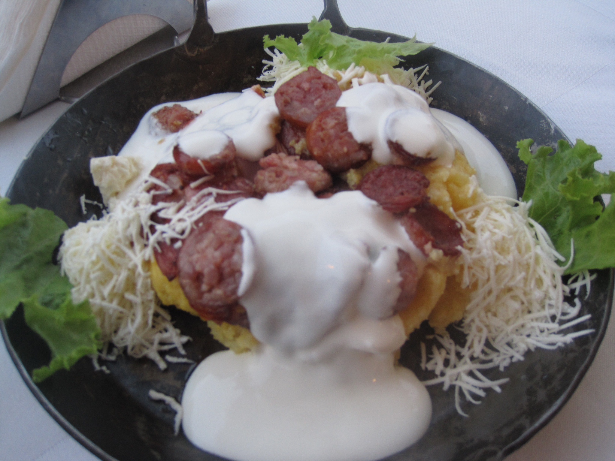 Tonight I had a food win. It seems like all the restaurants in the town only sold pizza, but most people were forgoing food, opting for ice cream instead. It seemed that every eighth person was chowing down on a bizarrely colored ice cream cone. There were at least 30 soft serve ice cream machines pulled out on the cobblestone street selling ice cream for $0.66-$1, depending how much you wanted. I ended up in a place that didn’t list pizza until the last page of the menu and ordered bulz ciobanesc. It was a roasted corn meal mush (kind of like polenta but better then any polenta I have had) and cheese base with lean crispy bacon and sausage on top covered in sour cream and a sharp (non cheddar) cheese. It might have been the richest thing I have ever had to eat. I had to leave most of the sour cream and cheese and my dinner set me back $8.