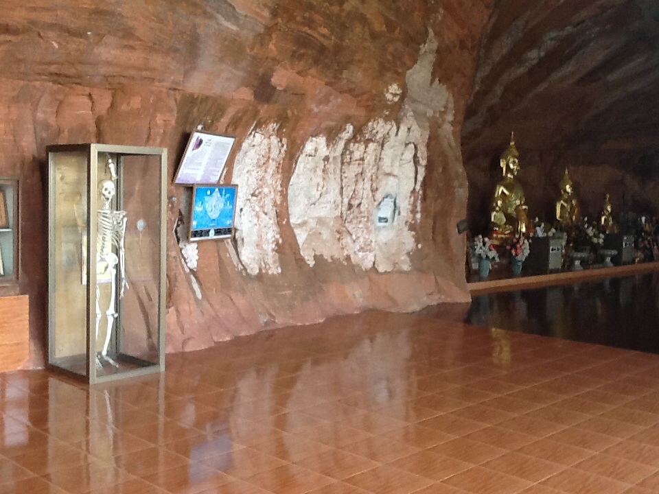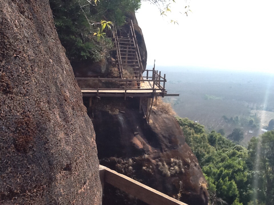 The first thing I noticed was that there was not one sign in English and after a wrong guess I started to wander up. Since my Thai reading skills are as good as my Farsi and Arabic reading skills I had no idea what the signs were saying. My theory was to go up and to the right whenever possible (being a circle I figured that would get me to the right spot). Holy shit was it scary, walking on old wooden planks supported on the side of a pretty shear cliff. The boards that were not nailed down were the worse and the railing on the outside was designed for someone who is 5’3. The views were pretty awesome and the ending part was on top of higher “mountain” in junglish terrain. I eventually got to the temple and discovered that going down was not going to involve any 2-4 foot wide walkways on the side of the mountain. To set the record straight after I got to the top I took off my long sleeve shirt. It is suppose to be warmer in Thailand.