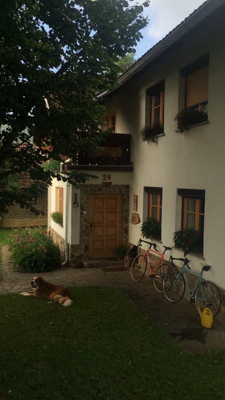 When I woke up the next morning it was still raining, we slept out the rain and got up at 830 and started cycling around 1015. We picked a realitivily flat path with 4-5k feet of elevation gain over 52ish miles that followed an established cycling trail near a river for the first 2/3 then we cut south towards Slovenj Gradec. After riding bikes for a few hours we stopped for some coffee, lunch, and a beer. In Slovenj Gradec we stopped in the tourist information center which is run by the government and they give you like 9 ounces of maps and information each time you stop in. It is a little much since we are on bikes so I make Chris carry it all. I was joking that the tourist farm we are staying at was at the top of a hill and it turns out that I was pretty right and it sure was a steep one. They have cows, pigs, a greenhouse, make their own flour, ect.