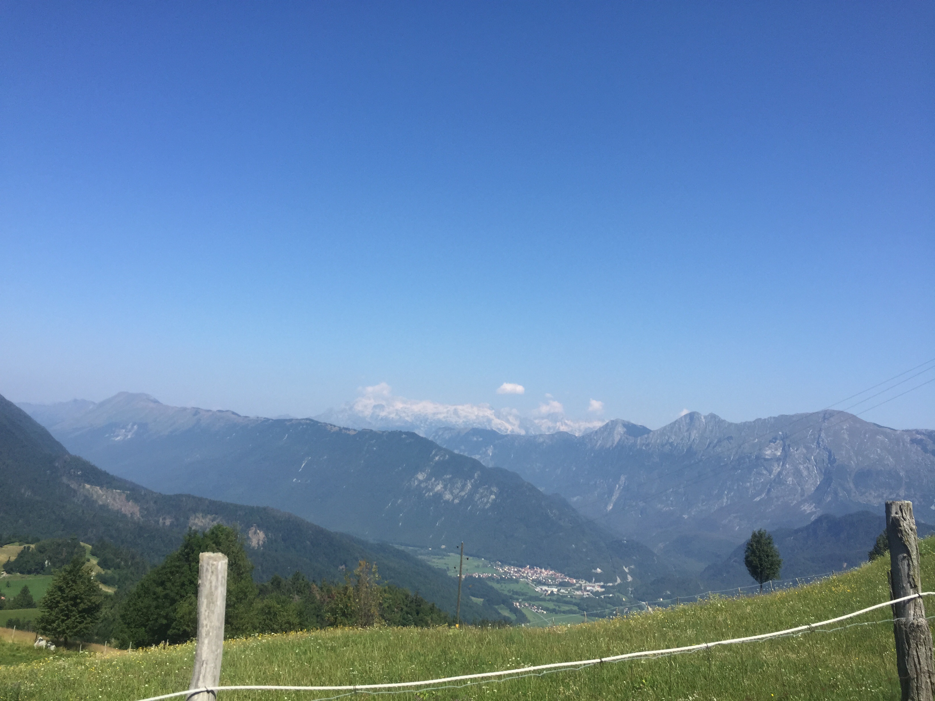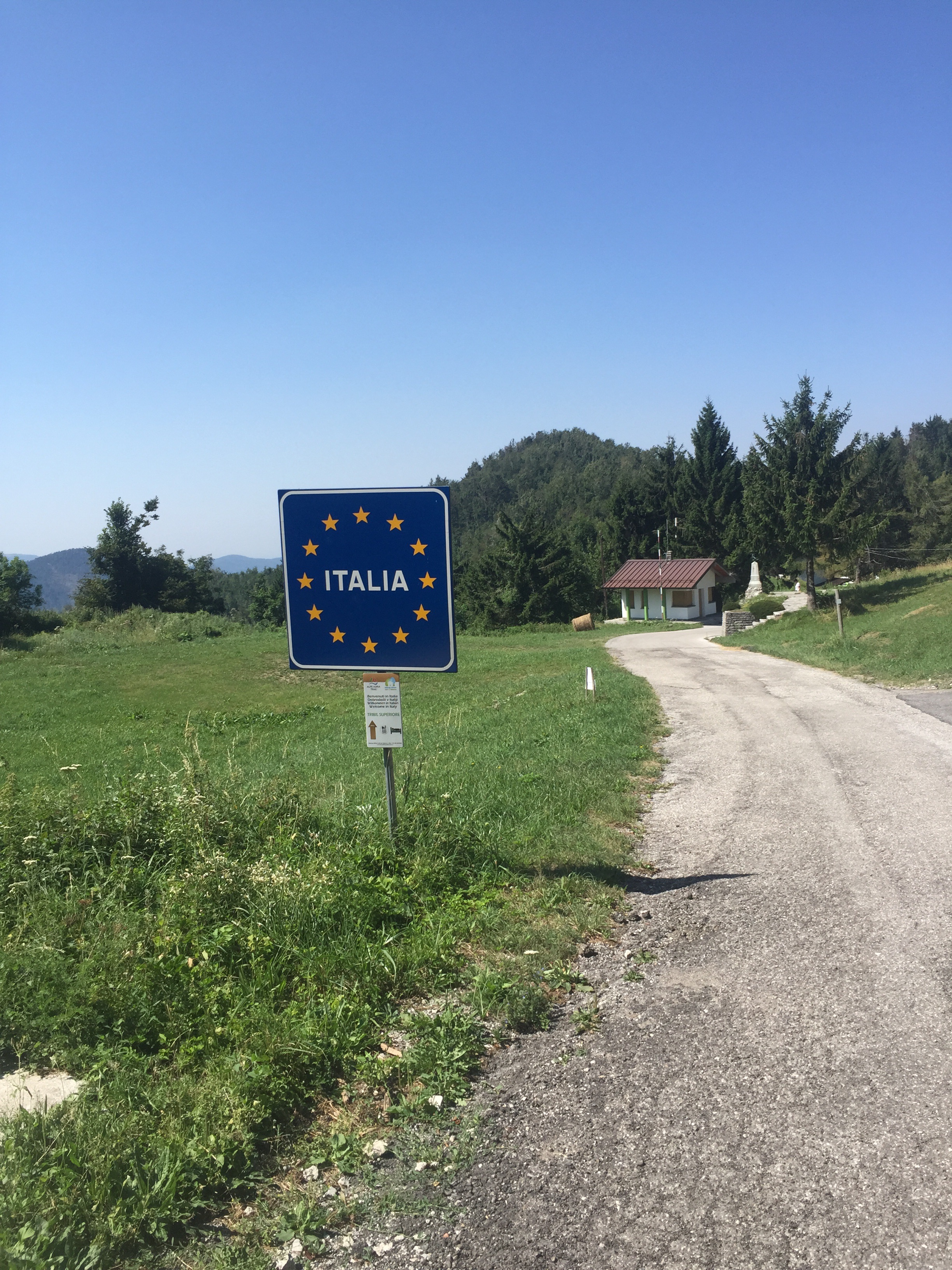 The next day we were all on plan for an 8am start when Chris’s bike tube broke after being pumped up. He changed the tube and we headed out to town and then discovered it was flat again, so he changed it again and we headed out to wine country via Italy in what turned out to be our longest day yet involving a little less than 60 miles and 6000 ft of climbing. The route took us through where Italy surrendered in WWI, an area with a lot of trenches and mountain fighting positions. We then continued along a ridges that separates Italy from Slovenia and grabbed lunch in Italy for lunch. English did not get us very far at lunch compared to 10km away in Slovenia where everyone speaks it. We ended up with pizza because the one page of the real menu was in Italian and the four pages of the pizza menu was in Italian and German. After the meal I declared that I was done with pizza for the rest of the trip. When we left the restaurant a Swiss guy stopped his car and asked us for directions, we gave some to him, not sure if they were right.