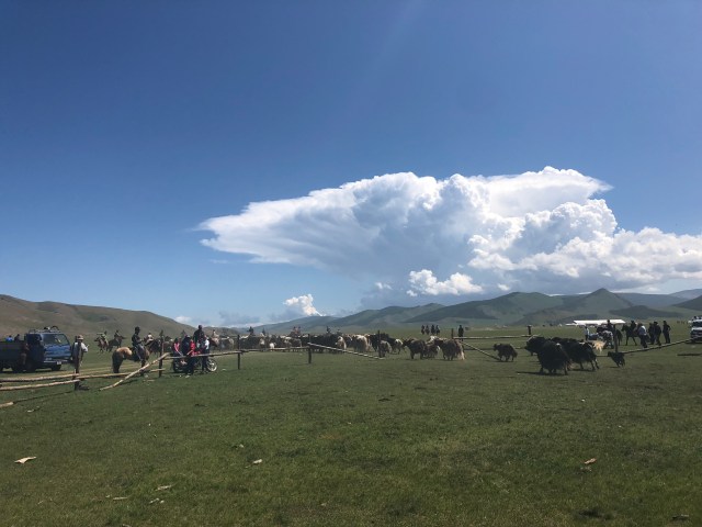 The event started with some traditional singing, horse head fiddle playing, teenage dance troupes,and speaking from local officials. There were a lot of yaks in a corral behind all the spectators, waiting for the events to begin. The hastily established corral had some shoddy workmanship though, and in the middle of the ceremony all of the yaks escaped (took several minutes for the crowd to notice). This eventually lead to all the kids on horseback (there were many) charging after them to wrangle them back into the corral.