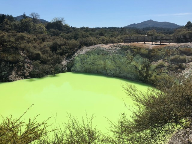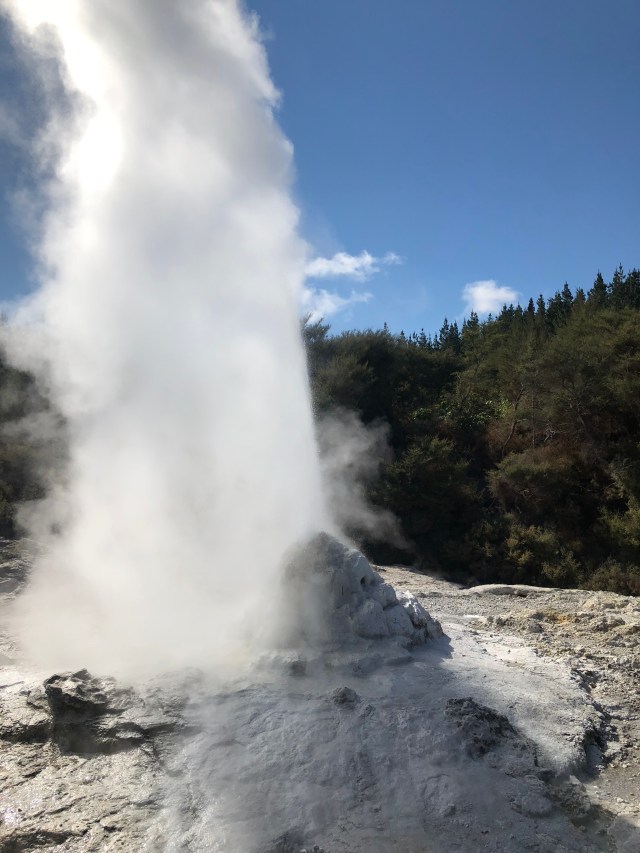 That morning we hiked out and then headed to our next camping area, Waikite Valley Hot Springs. The hot springs allow you to camp for $5 more than just single day admission. We got our fill of the hot springs in the evening and the next morning and then headed to the Wai-O-Tapu Thermal Wonderland, which is a geothermal pool park. One thing with New Zealand is that admission tickets to attractions in New Zealand are expensive, typically $20-60 NZD for admission, so you really need to pick and choose what you want to do. The geothermal park had a geyser that is not as faithful as Old Faithful, which means they add soap to break up the surface tension so it erupts on schedule at 10:30am every morning. There was a short walk around the area that had a lot of the geothermal activity. I would compare it to a miniature Yellowstone.