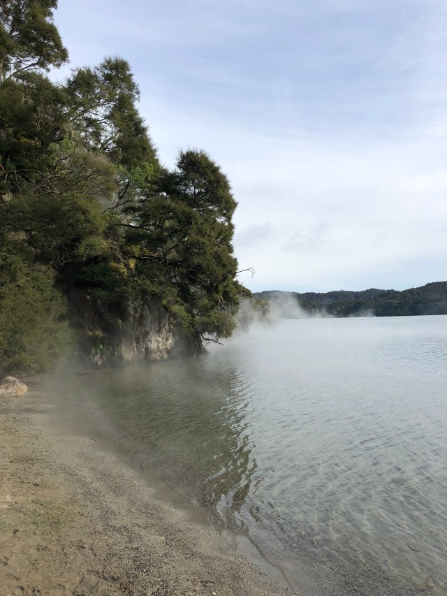 The next morning we made a detour to town and picked up some sneakers and then headed to the hot water beach trailhead. It was a 10 mile hike (or tramp in New Zealand English) partially around Lake Tarawera to the campground. The campground is only accessible by boat or trail, and the area gets its name from the near boiling geothermal water that flows into the lake at this point creating a hot tub like portion of the lake where it mixes with the cool lake water. It is a little more variable than a hot tub, since the water temperature wasn’t uniform from the top to the bottom, and sometimes you got surges of really hot or cold water. We went in the water for awhile and then cooked some dinner. That evening we played some cards and Settlers and got a few bug bites around our ankles. The bites initially felt like a small prick, but did not itch and just left a small red mark. The next morning was a different story. The small innocuous bites had turned into large hard red welts that itched furiously. That was our first introduction the New Zealand sand fly. We learned (the hard way) that sand fly bites itch for three weeks, and the welts that they leave can take a month or longer to go away. Needless to say they became rather unpleasant, and one of our next stops after the hike was to load up on bug spray. Sand flies normally appear near water and mainly stick within three feet of the ground so if you have pants and shoes on you tend to be pretty protected (Katy: or most people would be, they love Todd and are perfectly happy to bite him on any exposed skin).
