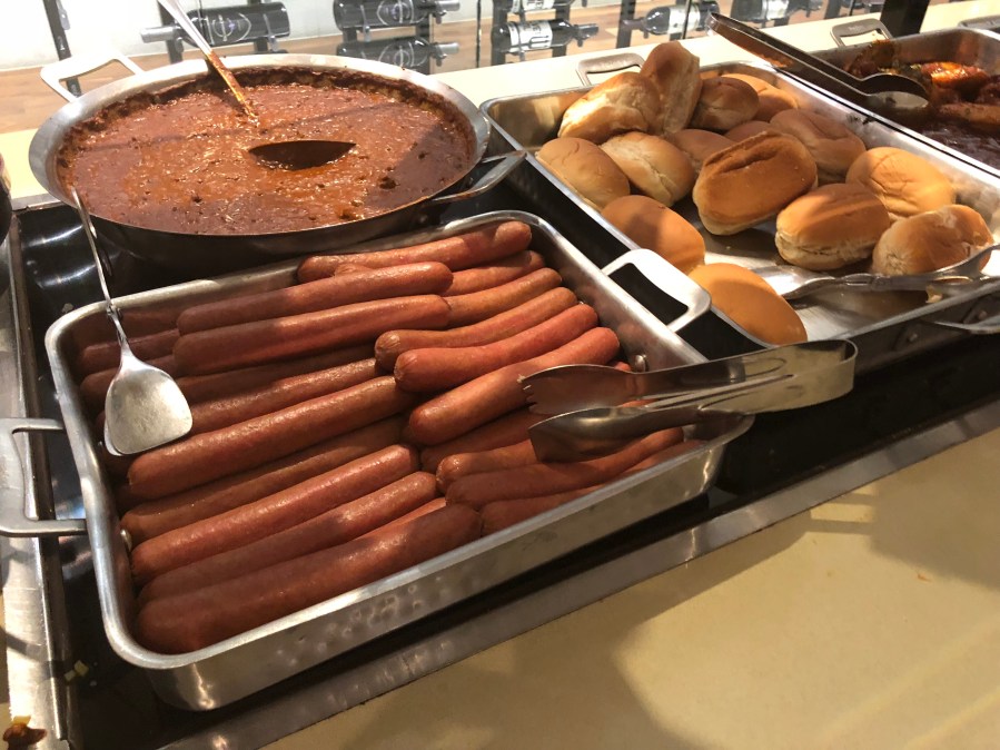 The lounge in LAX was celebrating the 4rth of July with hotdogs and watermelon