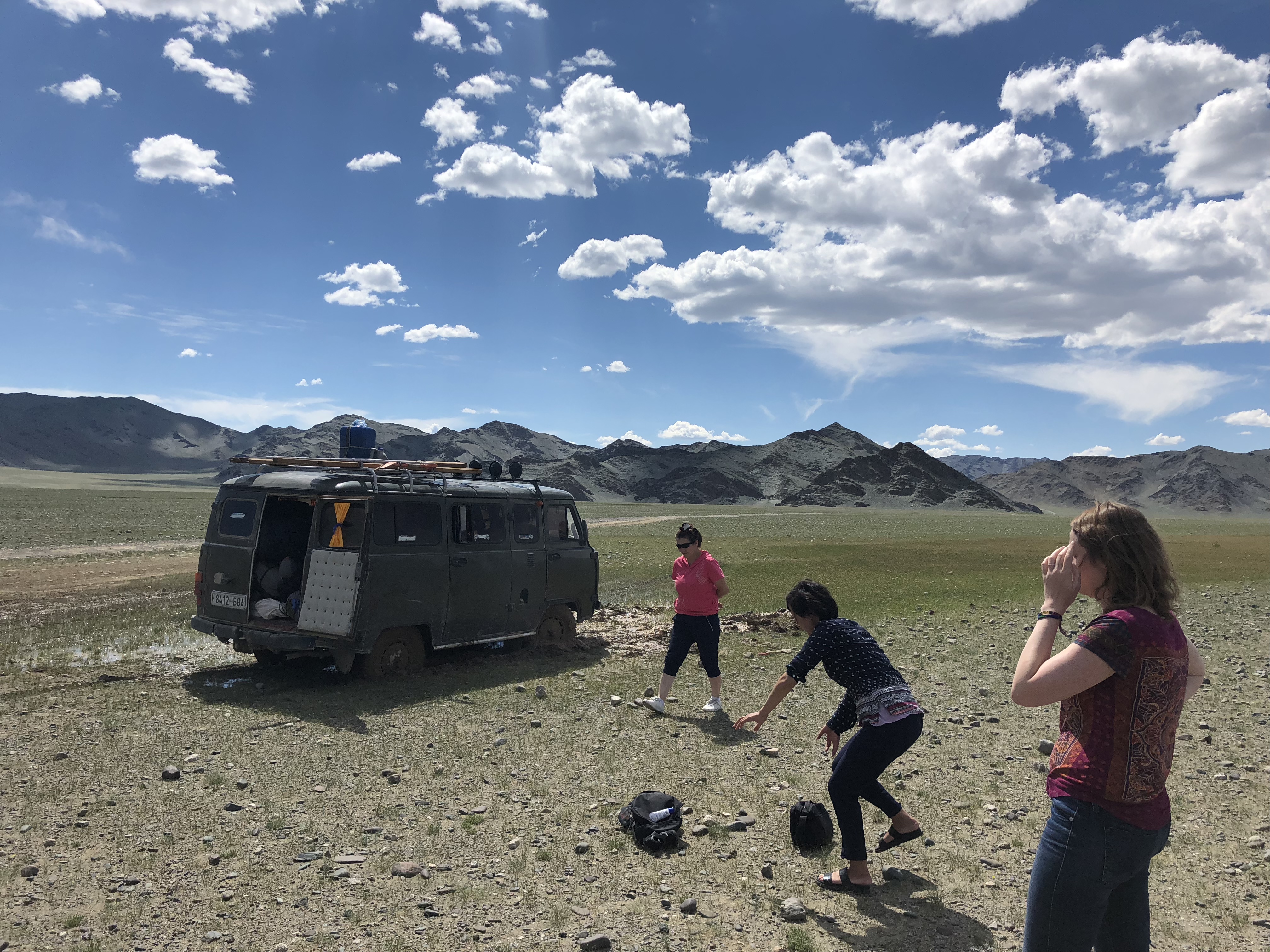 Oops, furgon got stuck in the mud, time to get rocks to add traction