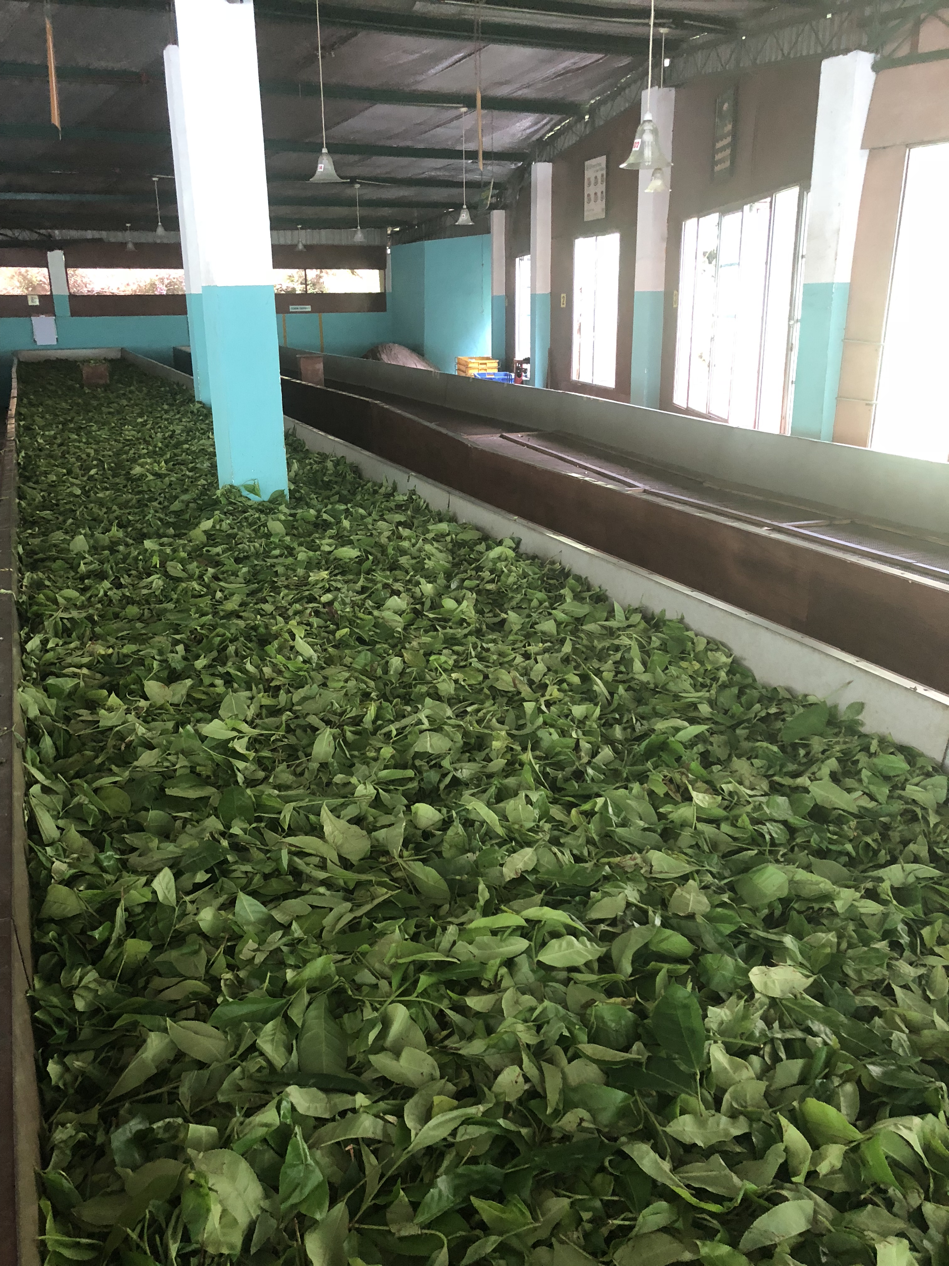 Tea being dried via a giant fan. Some of the leaves are pretty huge in this batch making me think it is not the highest quality