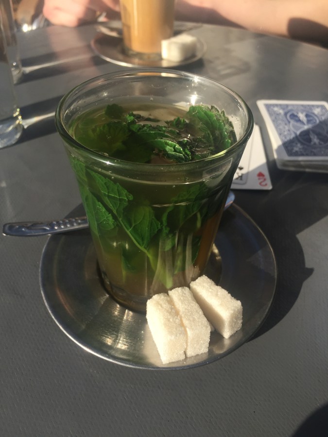 Moroccan mint tea at a plaza in Moulay Idress