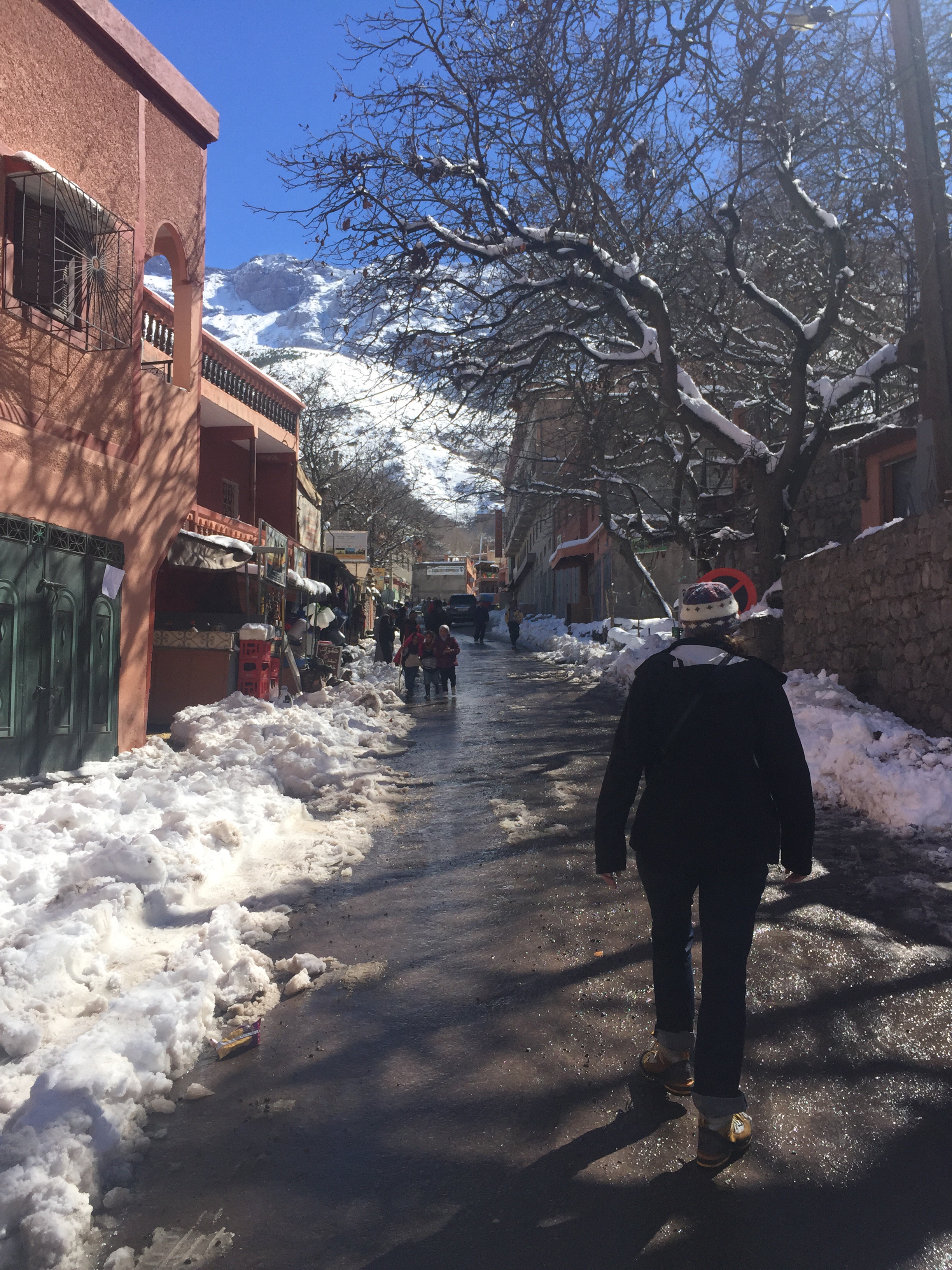 The made road in Imlil. Snow makes “traffic” a mess. There were more tourists here than I expected