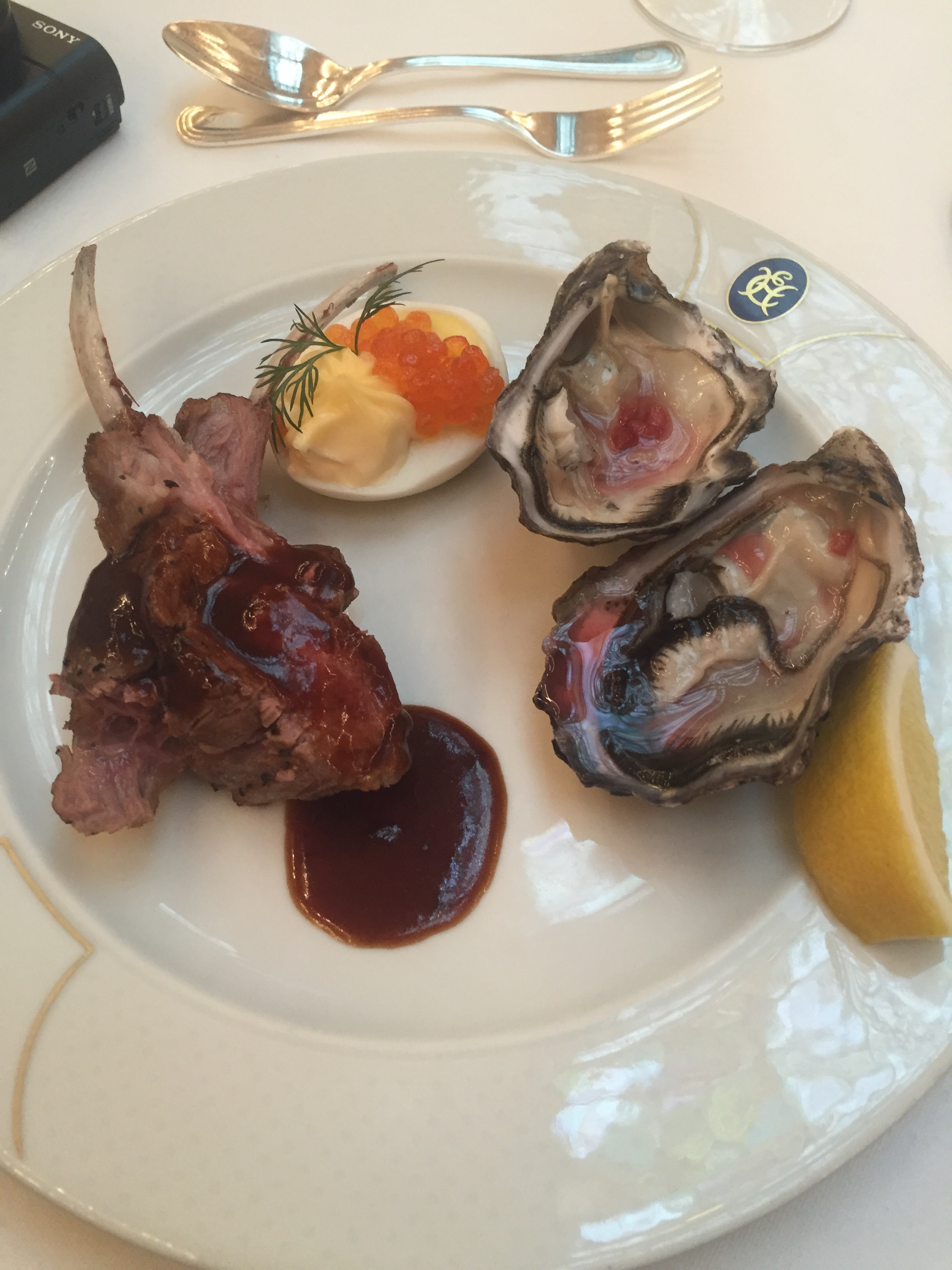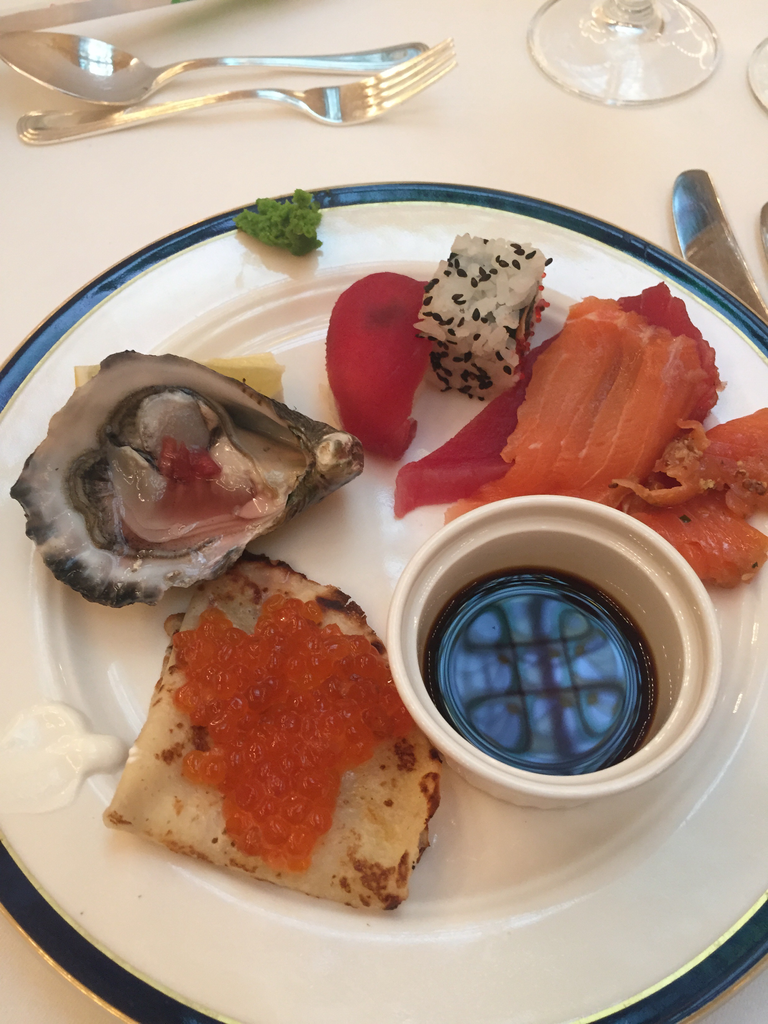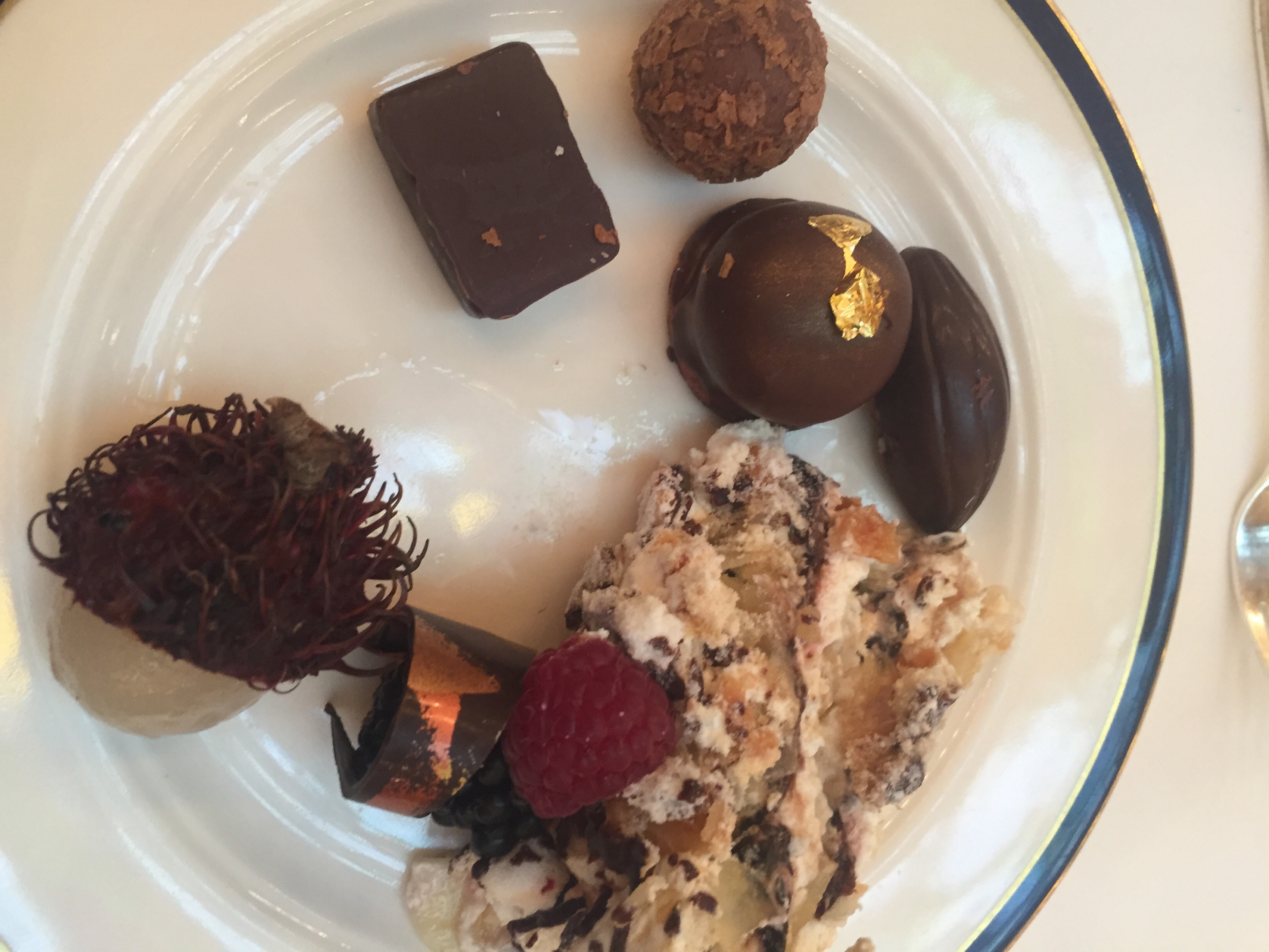 I started with quiche and hot chocolate for breakfast. This hot chocolate was really small and had two toasted marshmallows along with a glass of water. I drank some of it with a spoon. This style of hot chocolate and a croissant would be the best breakfast.